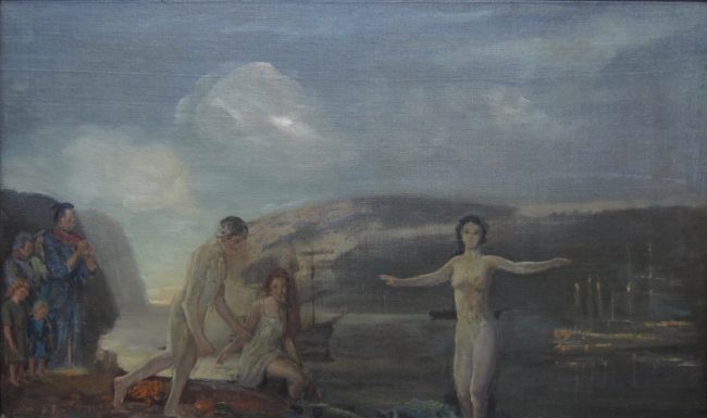 Arthur Bowen Davies – circa 1920 A quintessential oil on canvas by American modernist Arthur Bowen Davies. Titled ‘Fjording Song’ depicting a gathering of figures on the bluffs of a fjord, where masted sailing ships are moored. Early 20th century. Measures 17.5 inches by 29.5 inches sight size, and 23.25 inches by 35.25 inches by…