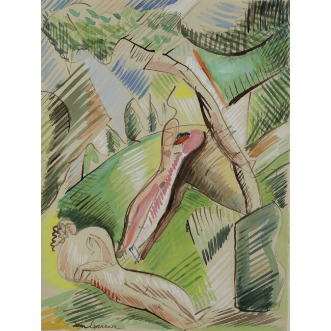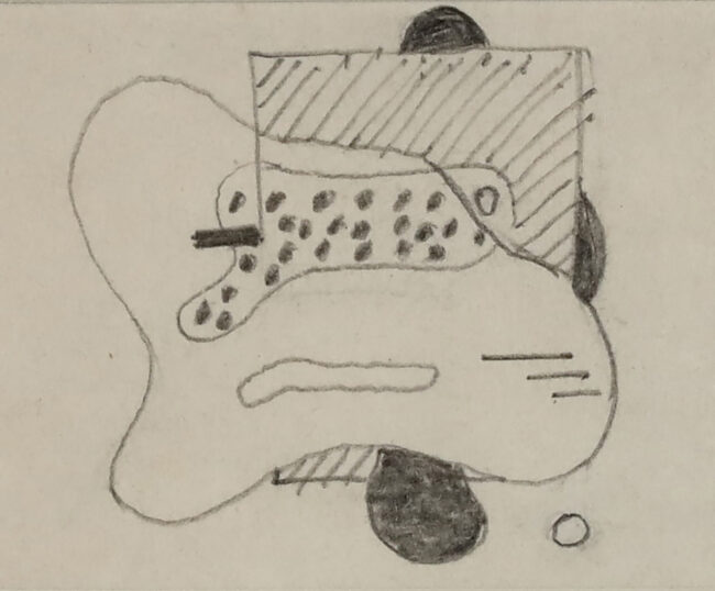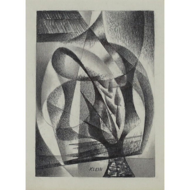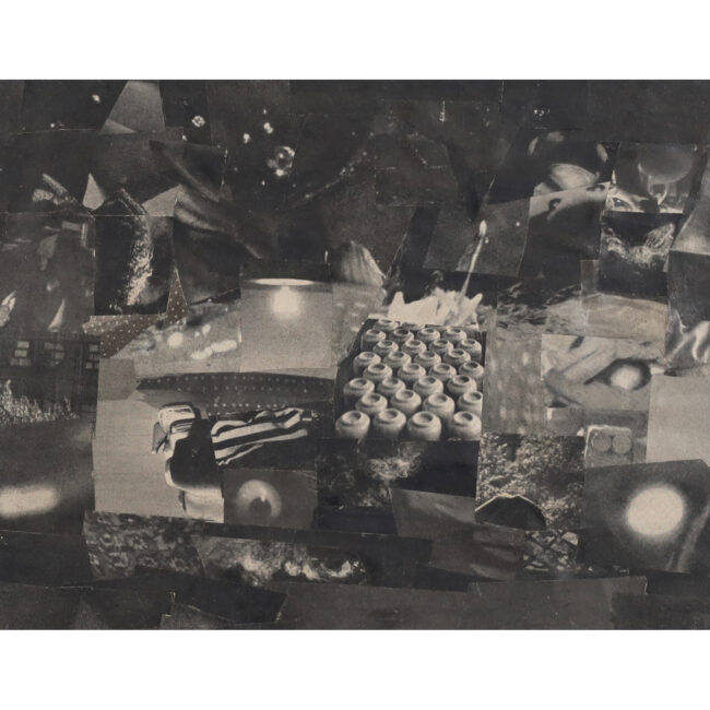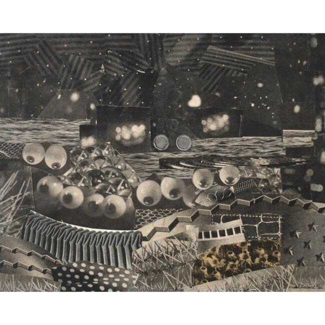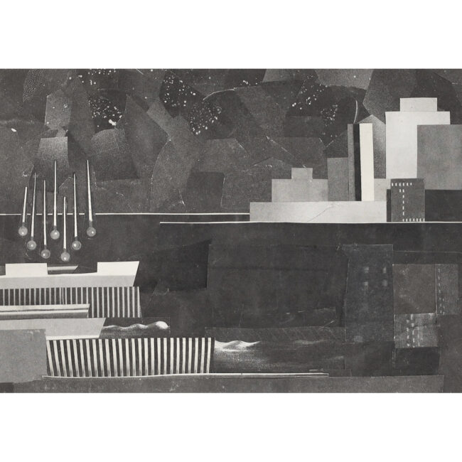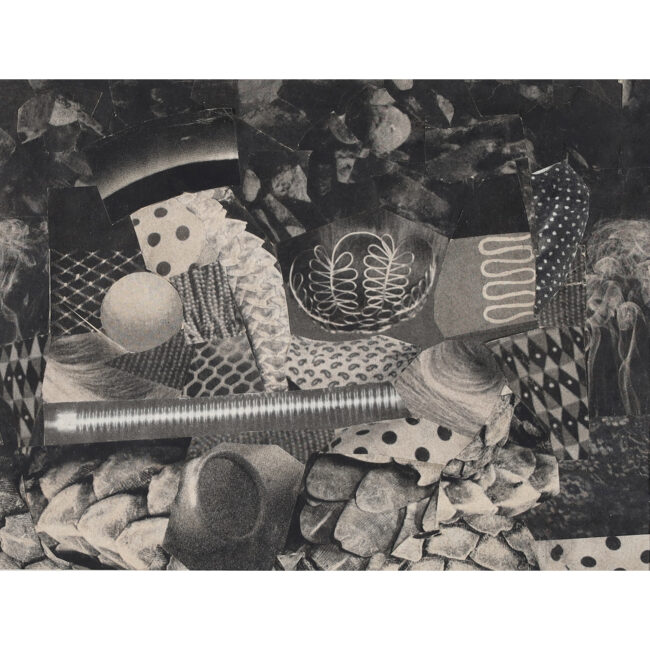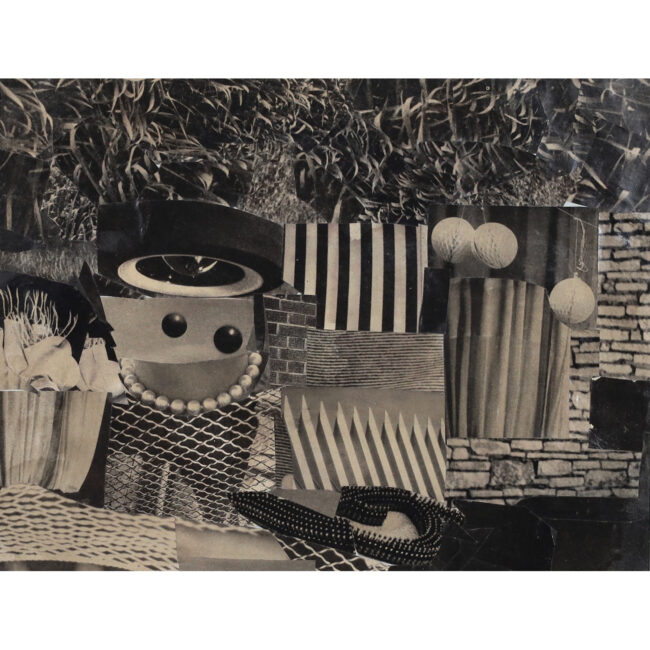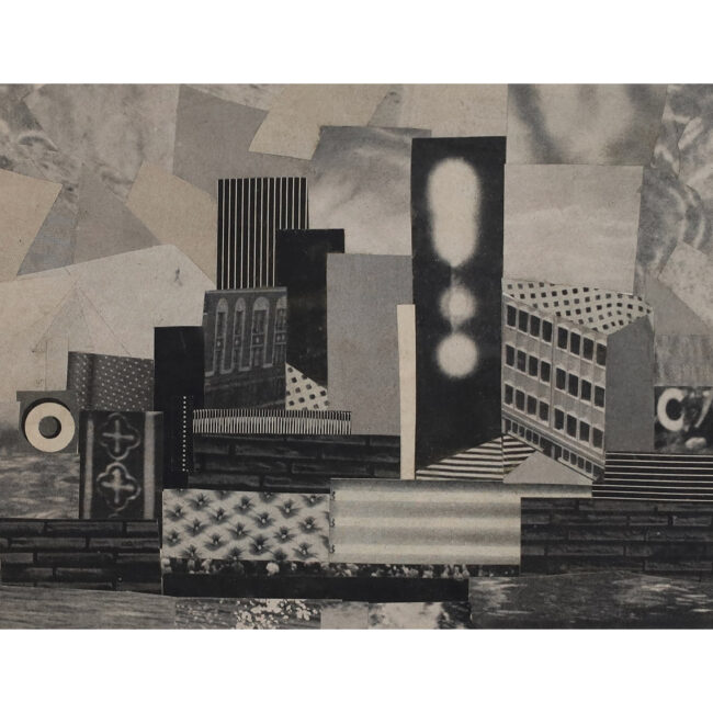 Janet Todd Young – Cityscape with Clouds Untitled – (Cityscape with Clouds) An abstracted cityscape created with collaged newsprint cut-outs of images, including of bricks, architecture, upholstery, and linear patterns. Collage on paper. c1930s-1940s. From a collection of work by the artist, including two sketchbooks, belonging to a member of the artist’s family. Ink stamped…