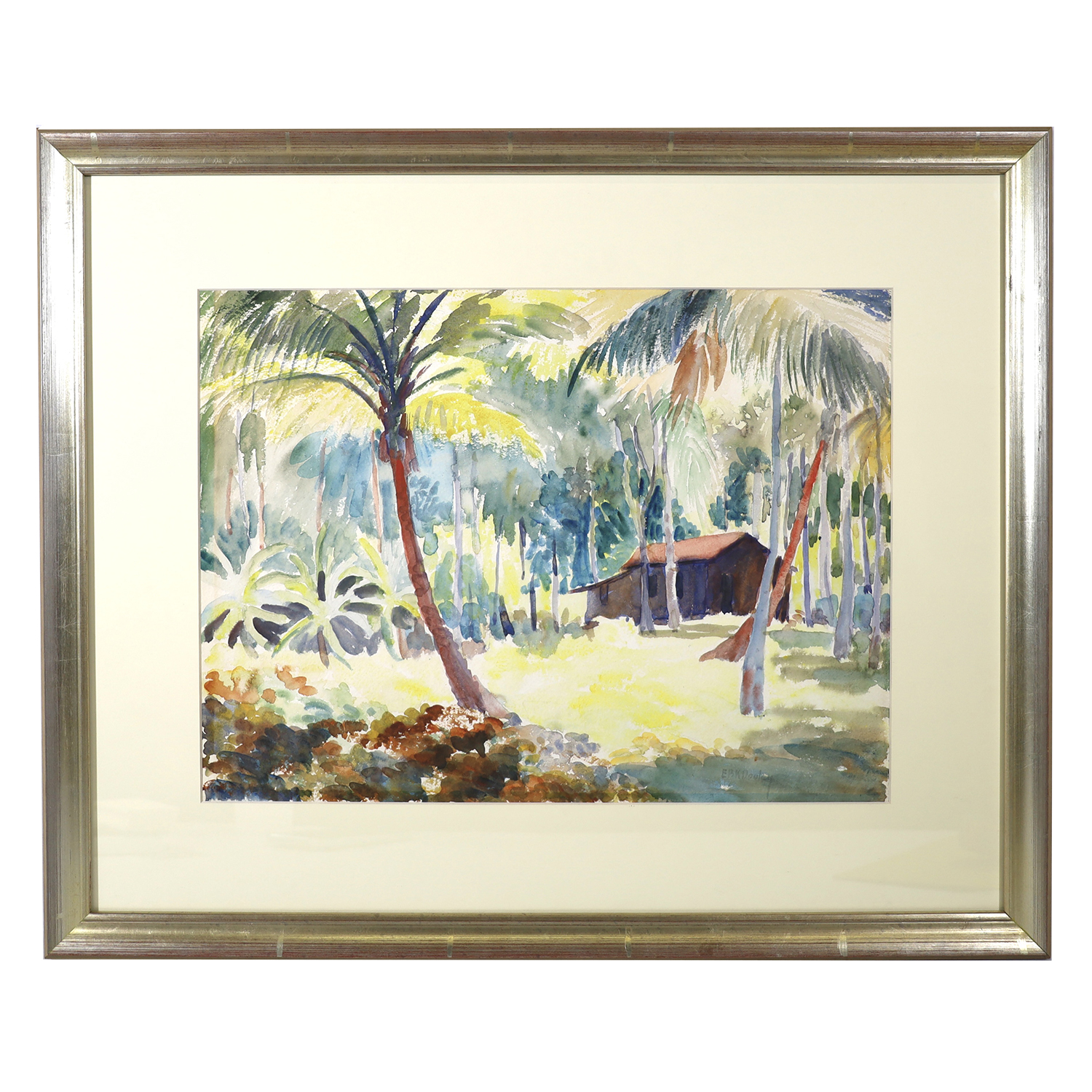 A colorful depiction of a tropical scene with huts by Eliza BK Dooley, most likely created while the artist was in Puerto Rico.