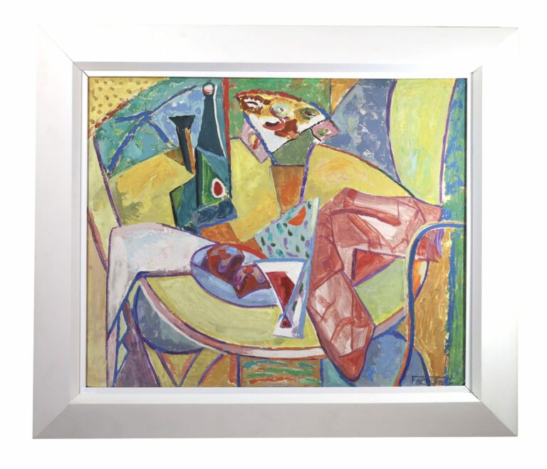 Large abstract painting of flowers and wine glass on a table by American modernist artist F. Alston Swift..