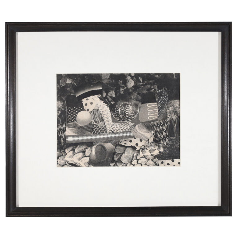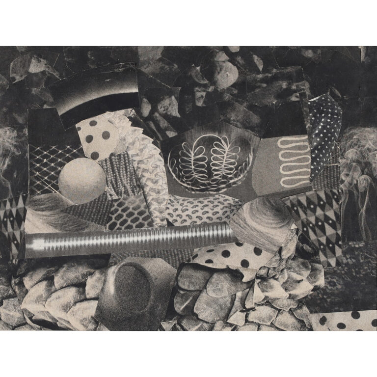 Collaged pictorial cut-outs from periodicals, including images polka dots, pine cones, fabric threads, and a spring.