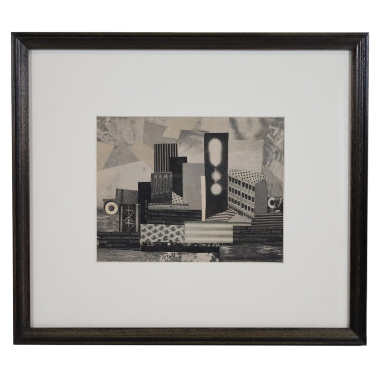 An abstracted cityscape created with collaged newsprint cut-outs of images, including of bricks, architecture, upholstery, and linear patterns.