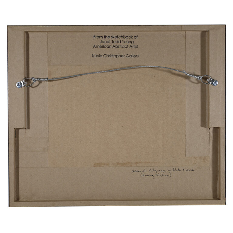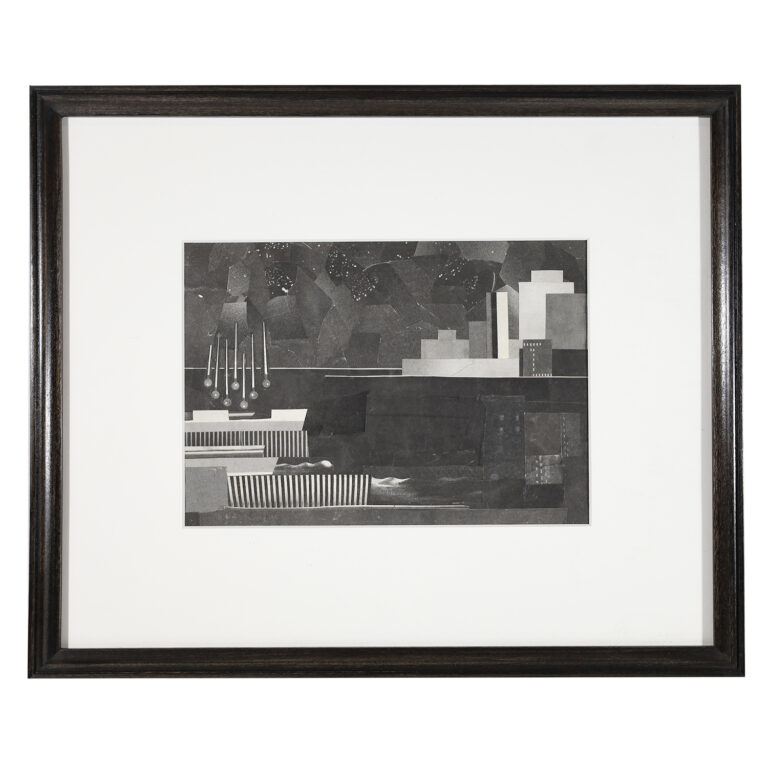 An early work, created with pasted minimalist cut-outs of periodicals creating what appears to be an abstract image of a ship in a city port, in the dark of night.