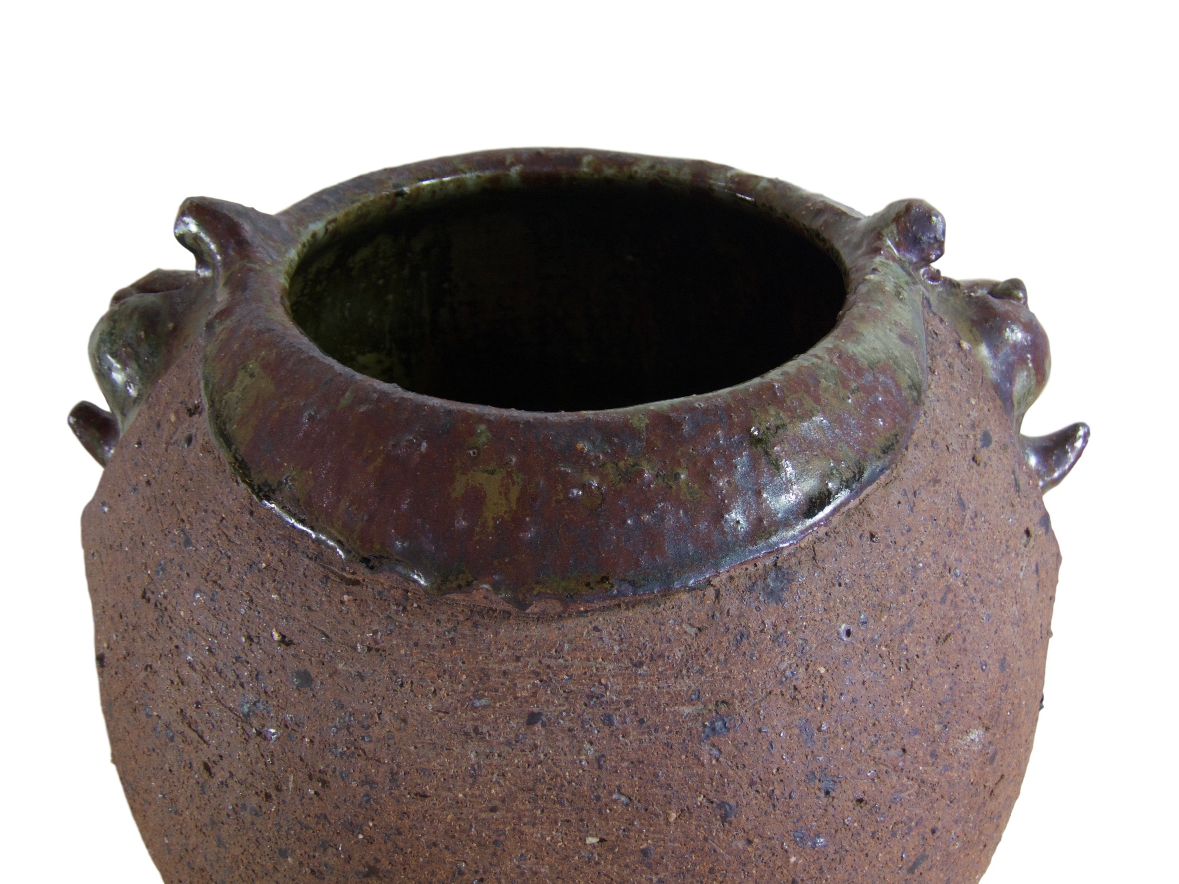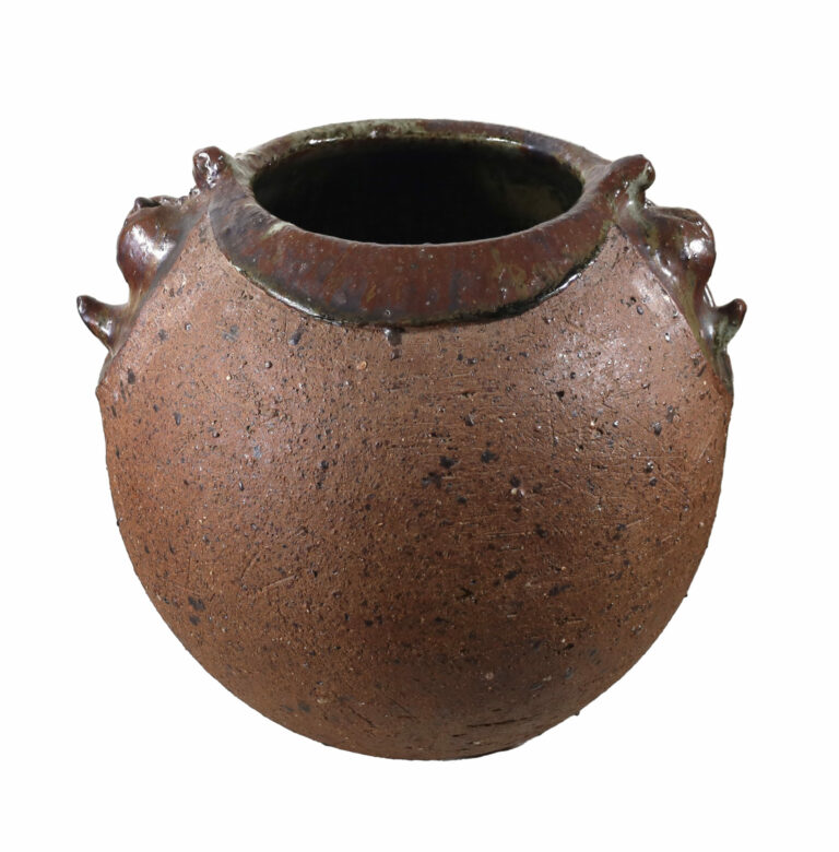 This work is a partially glazed stoneware vessel. It measures 14 x 16 x 15 inches overall.