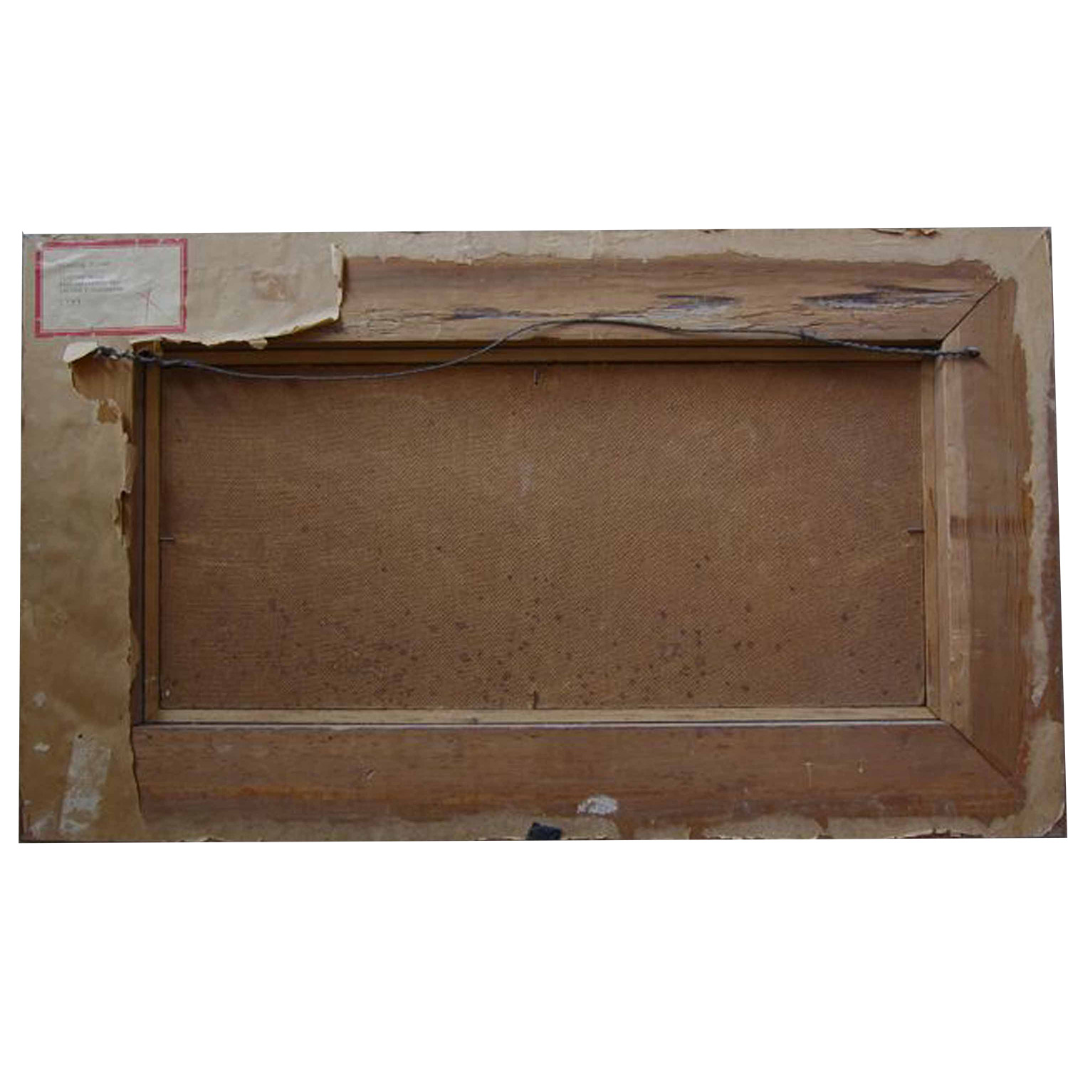 It is an oil on masonite board, and measures 8.5 x 19.5 inches sight size, and 16.25 x 26.75 x 2 inches overall, including the framing.